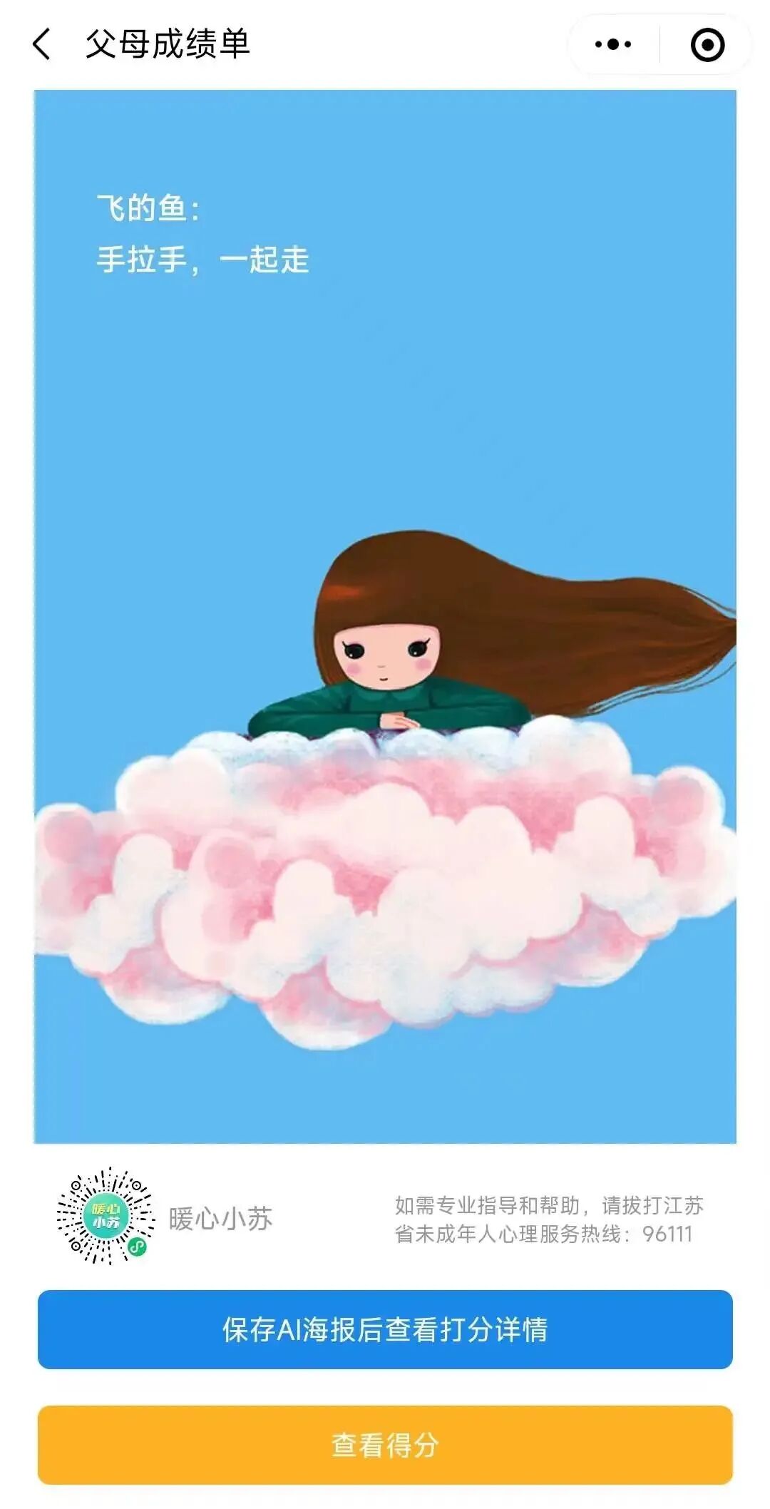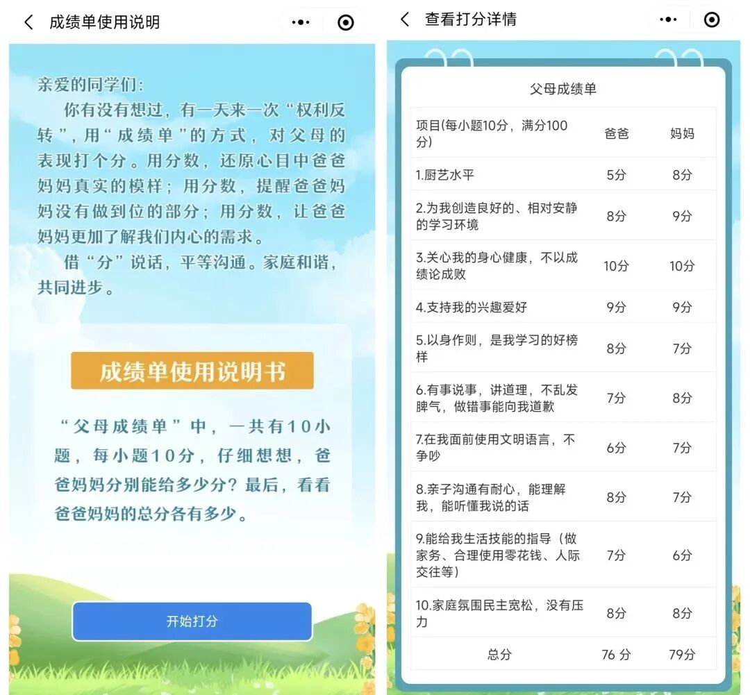 “交流周”期间由省文明办主办和指导省广电总台教育频道开发的“父母成绩单”小程序上线啦!!!快来参与吧!??????父母成绩单请父母预估一下,孩子会给你打多少分,你能及格吗?