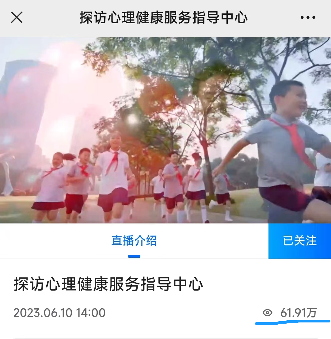 体验周“体验周”期间,《成长》栏目推出特别策划——探访心理健康服务指导中心直播活动,走进张家港市社会心理服务指导中心、泰州市未成年人成长指导中心、南京师范大学附属中学树人学校积极心理中心,通过真实记录互动场景,打破大众对于心理健康领域的固有认知,让大家了解身边的心理健康服务指导中心,让更多青少年感受心理学的魅力,进一步增强对心理健康的多元认知。直播活动持续4个多小时,浏览量达61.91万人次。