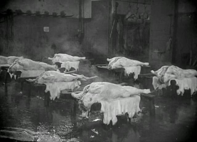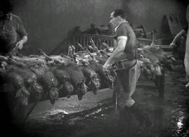 不过,一个鲜有的例外出现在该书接近尾声处对“我们时代的电影”与恐怖之间关系的讨论中,这里提到的恐怖几乎不言而喻,就是当时人类刚刚遭遇的历史的恐怖。在相关的论述中,克拉考尔引入了一个具体影片的例子:法国导演乔治·弗朗叙(Georges Franju)的《动物的血》(Le Sang des Bêtes)。这部1948年的纪录片以一种极其冷峻的风格将巴黎一座屠宰场内部的血腥画面与外面安静、祥和的城市生活和街道景观并置在一起。有趣的是,克拉考尔在他的文字中以同样冷峻的笔调带入了另一重并置:“我们在观看排列成行的小牛脑袋或关于纳粹集中营的影片中横七竖八的人体之后,本来隐藏在恐惧和想象的幕布后面的看不见的可怕景象便恢复了其原来面貌。”[34]弗朗叙的影片不知是否在讽刺性地暗示,在刚刚过去的战争岁月里,法国维希政权与德国法西斯暴行之间存在一种暧昧关系,但克拉考尔用几乎是蒙太奇的方式,将巴黎屠宰场与纳粹集中营并置在一起。我们不免要问,这难道不正是爱森斯坦在《罢工》(Strike,1925)里的那个著名段落所使用的手法(屠宰场杀牛和工人遭屠戮的场景被平行剪辑在一起)吗?在接下来关于电影“揭露”功能的论述中,克拉考尔说明了这种蒙太奇技巧更一般性的法则,即“让可见的物质现实和我们的现实概念进行对质”,前者总是对后者——即“我们的物质世界概念”“我们的错误的现实概念”——构成质疑和挑战。就这一对摄影机功能的理解,克拉考尔高度赞扬爱森斯坦、普多夫金(Vsevolod Pudovkin)在20世纪20年代的工作,因为在那些代表苏联蒙太奇学派乃至整个世界电影艺术最高峰的作品中,他们“很注意在这些方面进行的种种的对比”[35]。