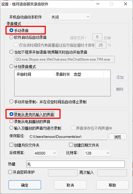 2,在设置界面主要有两项参数需要设置,其一为录音模式,这里将其设置为最简单的“手动录音”,即通过手动点击“开始”及“停止”按钮来开始及结束录音。另外也可设置软件开机后自动录音,及自动对微信,QQ,Skype等语音视频通话录音,还可设置计划录音(即在某一个时间点自动开始录音)。