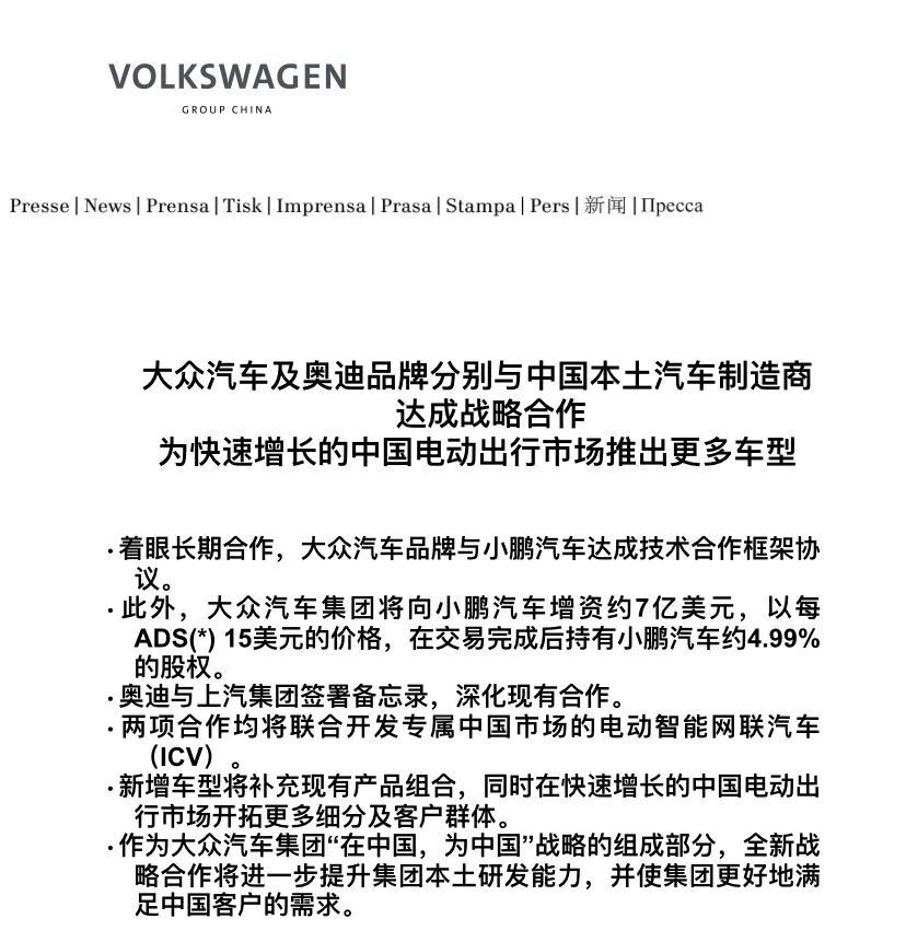 大众汽车集团将向小鹏汽车增资约 7 亿美元,以每 ADS(*) 15 美元的价格收购小鹏汽车约 4.99%的股权;