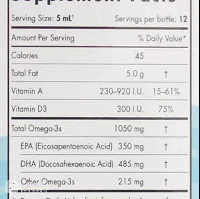 每5ml含485mgDHA和350mgEPA。如果是3-18岁的娃,每天需要100-250mg的DHA+EPA,那么只需要补充1毫升就够了。该产品含维生素D3,注意相应减少VD3的补充。