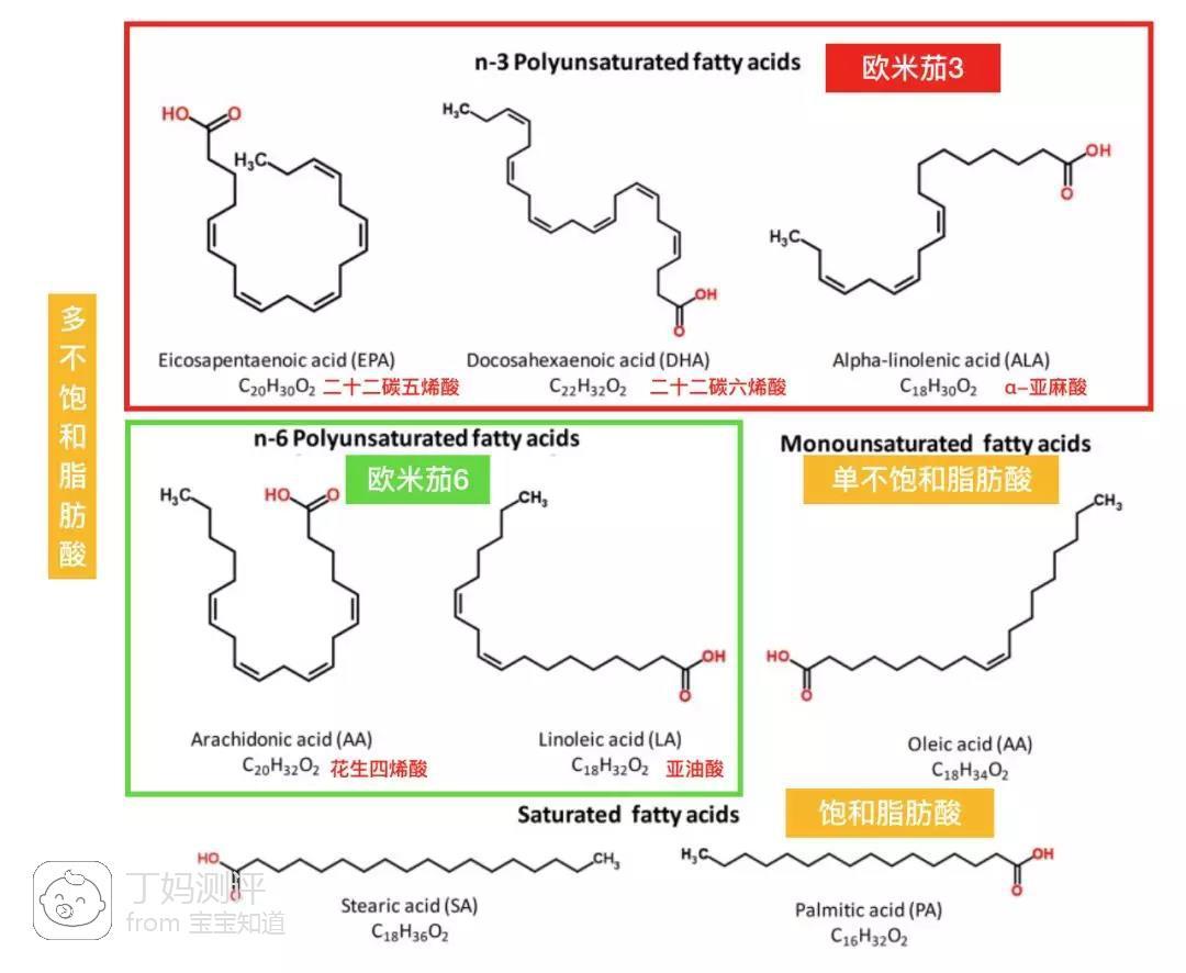 DHA(二十二碳六烯酸)和EPA(二十二碳五烯酸)属于欧米伽3家族。AA(花生四烯酸)和LA(亚油酸)属于欧米伽6家族。