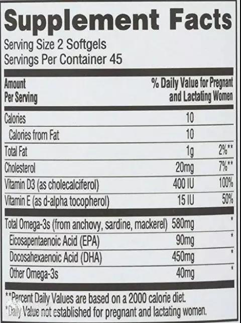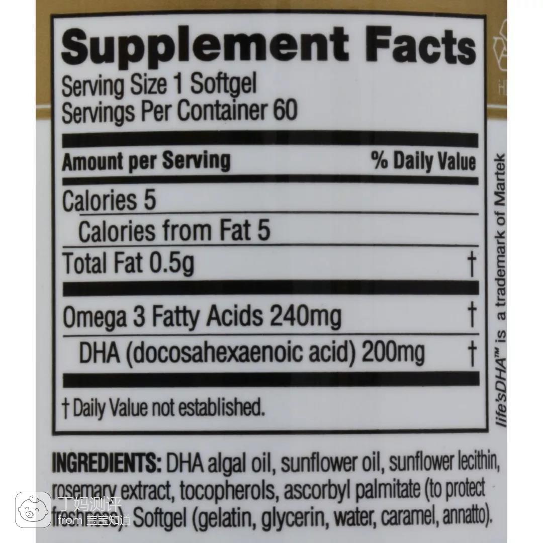 每2粒含450mgDHA和90mgEPA。孕期、哺乳期每天需要200mg的DHA,那么每天吃1粒就够了。6个月-2岁的小baby每天需要70-100mgDHA可以两、三天吃一粒(挤到食物中)。含维生素D3,注意相应减少VD3的补充。