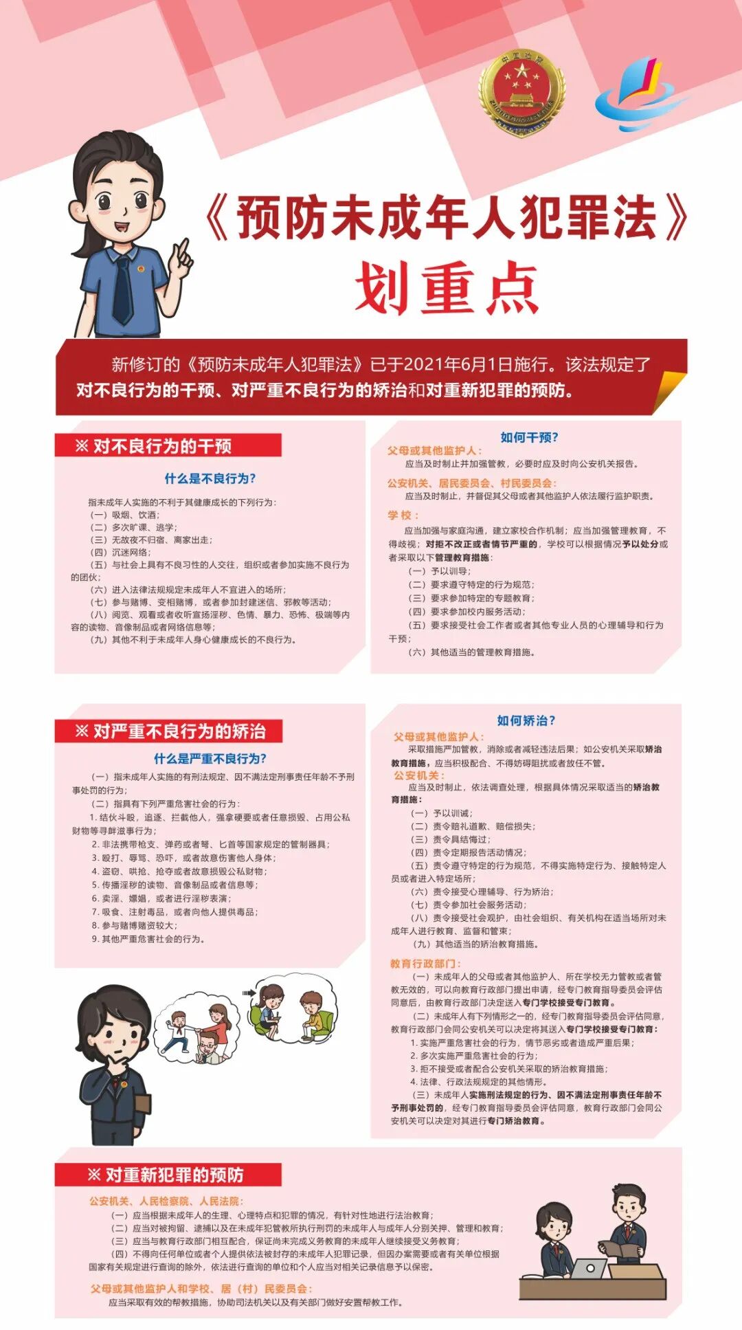 新修订的《预防未成年人犯罪法》已于2021年6月1日施行。该法规定了对不良行为的干预、对严重不良行为的矫治和对重新犯罪的预防。