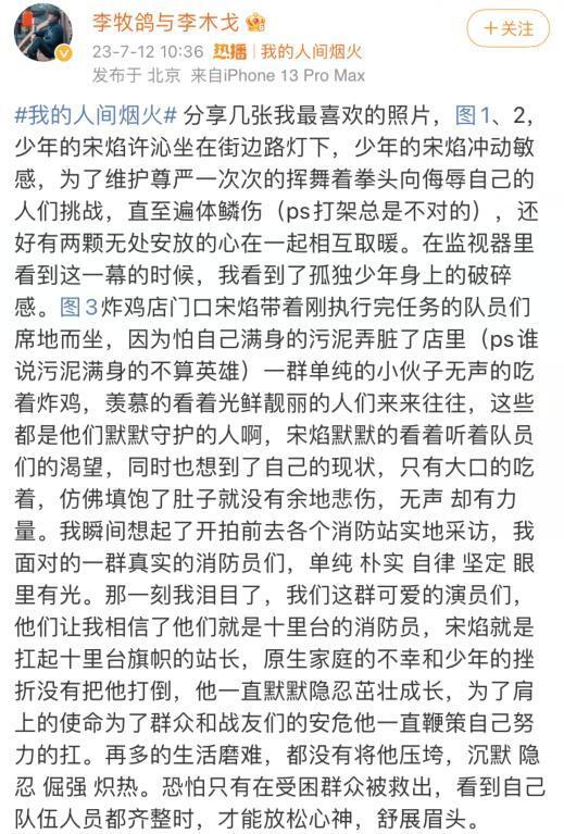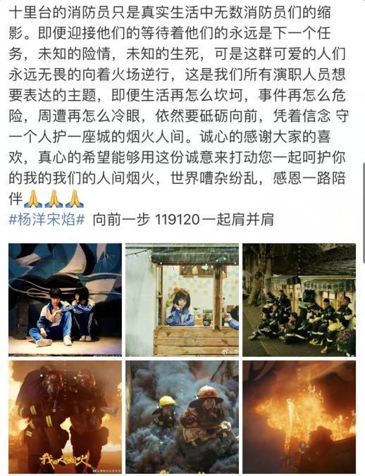 导演李木戈12号发文谈到了关于这部剧,并着重介绍了杨洋饰演的宋焰一角,想必也是想尽可能地拉回观众对剧集本身的关注点,文中提到了杨洋他们在拍摄消防戏份时的日常,让镜头前的导演感觉他们就是一群真实的消防员,也着重介绍了剧中宋焰一角的人设,原生家庭的不幸和少年的挫折没有将他打倒,默默隐忍茁壮成长,有危险更是一直冲在队友最前面,扛起救援最重的担子,生活的磨难更是让他成长成为一名有担当,有孝心,有抱负的男子汉。