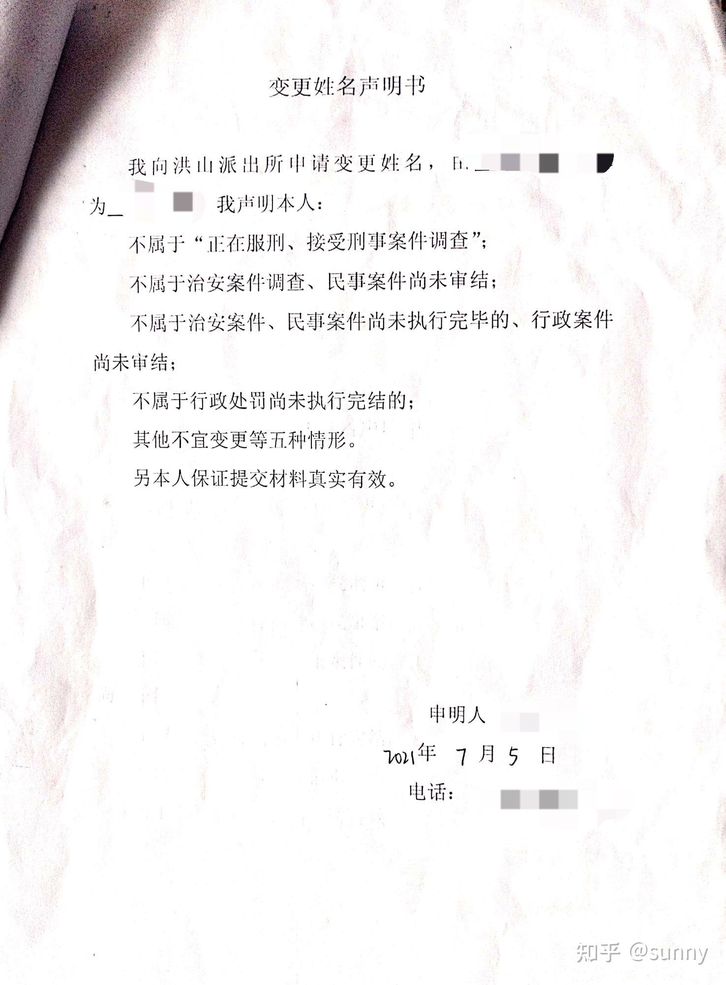 我去找派出所所长签一下字,所长比较好,问了一下原因,让我保证所有责任自己承担之后就签了。又给了一张变更姓名声明书,签好就完了,如下: