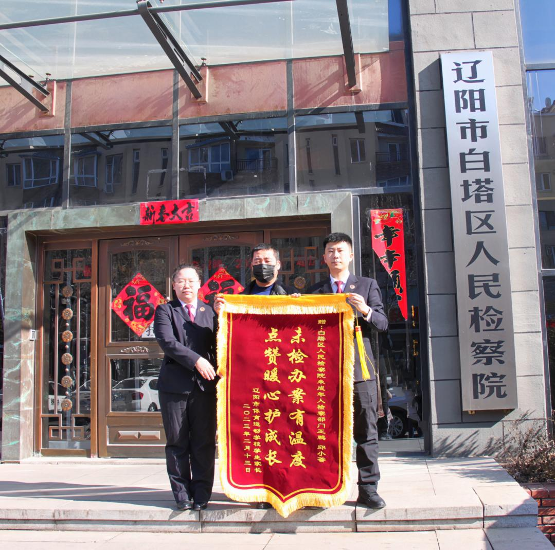 2023年2月14日一大早,辽阳市白塔检察机关作出附条件不起诉决定的5未成年犯罪嫌疑人,在家长陪伴下将一面绣有“未检办案有温度 点赞暖心护成长”的锦旗,送到该院未检检察官的手中,表达他们的感激之情。