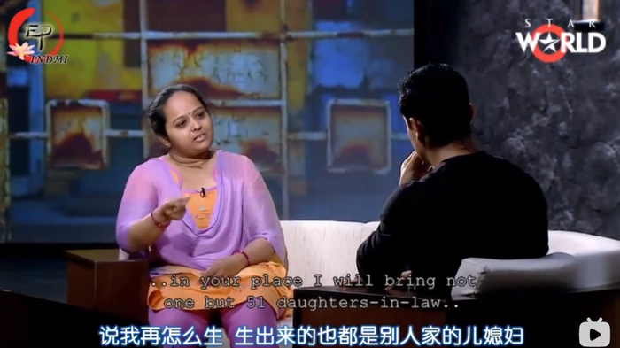阿米尔·汗采访的另外一位女性,在生下一个女儿后,丈夫为了要一个儿子让她频繁怀孕,屡次堕胎,最后一次的时候,她隐瞒自己怀孕的事实,在娘家生产,又有了一个女儿。
