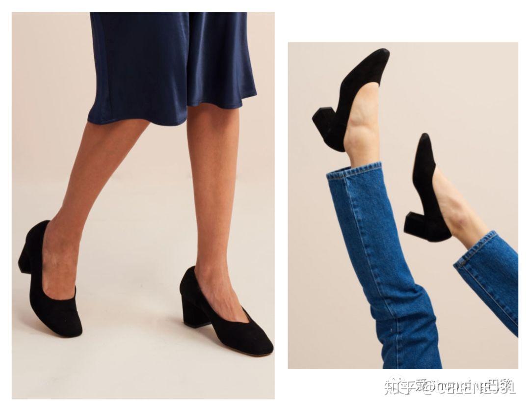 夏天也可以尝试一些鞋头比较有钝感的的粗跟,比较Rouje下面这双黑色粗跟,搭配牛仔裤和裙子都很百搭: