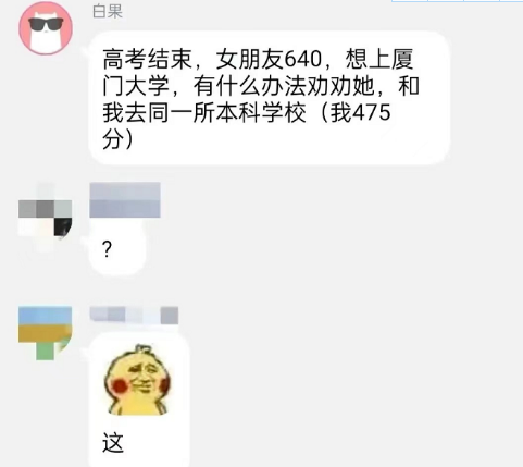 男生高考得分475分,在当地是二本的分数线。他想要女朋友报考和他一样的志愿,来陪他。毕竟他想去厦门大学不可能,但是640分向下兼容就很容易。