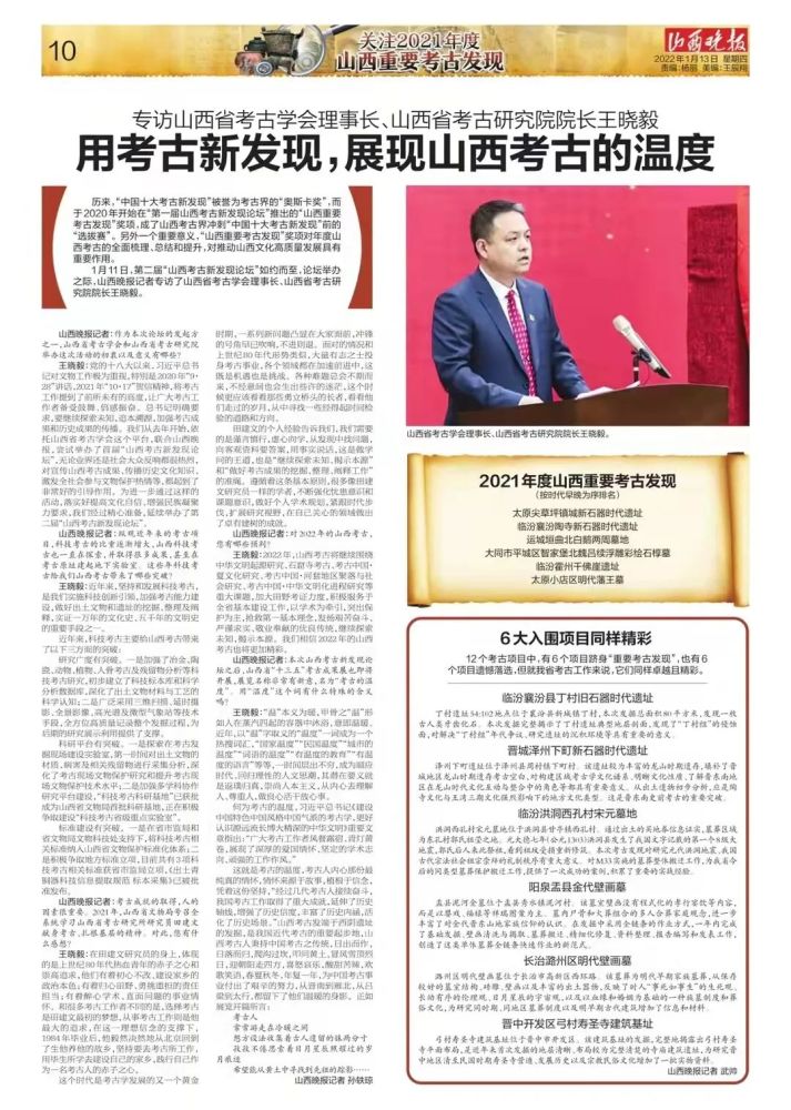 王晓毅:2022年,山西考古将继续围绕中华文明起源研究、石窟寺考古、考古中国·夏文化研究、考古中国·河套地区聚落与社会研究、考古中国·中华文明化进程研究等重大课题,加大田野考证力度,积极服务于全省基本建设工作,以学术为牵引,突出保护为主,抢救第一基本理念,发扬艰苦奋斗、严谨求实、敬业奉献的优良传统,继续探索未知,揭示本源。我们相信2022年的山西考古也将更加精彩。