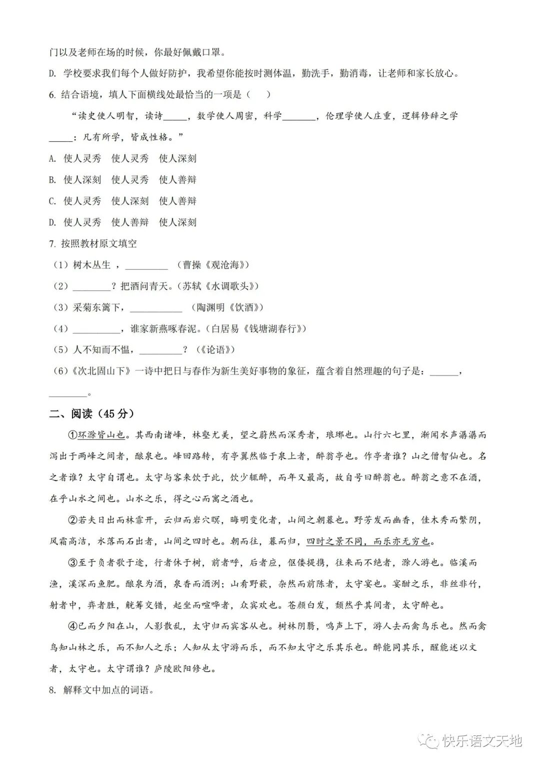门以及老师在场的时候,你最好佩戴口罩。D.学校要求我们每个人做好防护,我希望你能按时测体温,勤洗手,勤消毒,让老师和家长放心。6.结合语境,填人下面横线处最恰当的一项是()“读史使人明智,读诗_____,数学使人周密,科学_______,伦理学使人庄重,逻辑修辞之学_____:凡有所学,皆成性格。”A.使人灵秀使人灵秀使人深刻B.使人深刻使人灵秀使人善辩C.使人灵秀使人深刻使人善辩D.使人灵秀使人善辩使人深刻7.按照教材原文填空(1)树木丛生,_________(曹操《观沧海》)(2)________?把酒问青天。(苏轼《水调歌头》)(3)采菊东篱下,___________(陶渊明《饮酒》)(4),谁家新燕啄春泥。(白居易《钱塘湖春行》)(5)人不知而不愠,?(《论语》)(6)《次北固山下》一诗中把日与春作为新生美好事物的象征,蕴含着自然理趣的句子是:,。二、阅读(45分)①环滁皆山也。其西南诸峰,林壑尤美,望之蔚然而深秀者,琅琊也。山行六七里,渐闻水声潺潺而泻出于两峰之间者,酿泉也。峰回路转,有亭翼然临于泉上者,醉翁亭也。作亭者谁?山之僧智仙也。名之者谁?太守自谓也。太守与客来饮于此,饮少辄醉,而年又最高,故自号曰醉翁也。醉翁之意不在酒,在乎山水之间也。山水之乐,得之心而寓之酒也。②若夫日出而林霏开,云归而岩穴暝,晦明变化者,山间之朝暮也。野芳发而幽香,佳木秀而繁阴,风霜高洁,水落而石出者,山间之四时也。朝而往,暮而归,四时之景不同,而乐亦无穷也。③至于负者歌于途,行者休于树,前者呼,后者应,伛偻提携,往来而不绝者,滁人游也。临溪而渔,溪深而鱼肥。酿泉为酒,泉香而酒洌;山肴野蔌,杂然而前陈者,太守宴也。宴酣之乐,非丝非竹,射者中,弈者胜,觥筹交错,起坐而喧哗者,众宾欢也。苍颜白发,颓然乎其间者,太守醉也。④已而夕阳在山,人影散乱,太守归而宾客从也。树林阴翳,鸣声上下,游人去而禽鸟乐也。然而禽鸟知山林之乐,而不知人之乐;人知从太守游而乐,而不知太守之乐其乐也。醉能同其乐,醒能述以文者,太守也。太守谓谁?庐陵欧阳修也。8.解释文中加点的词语。