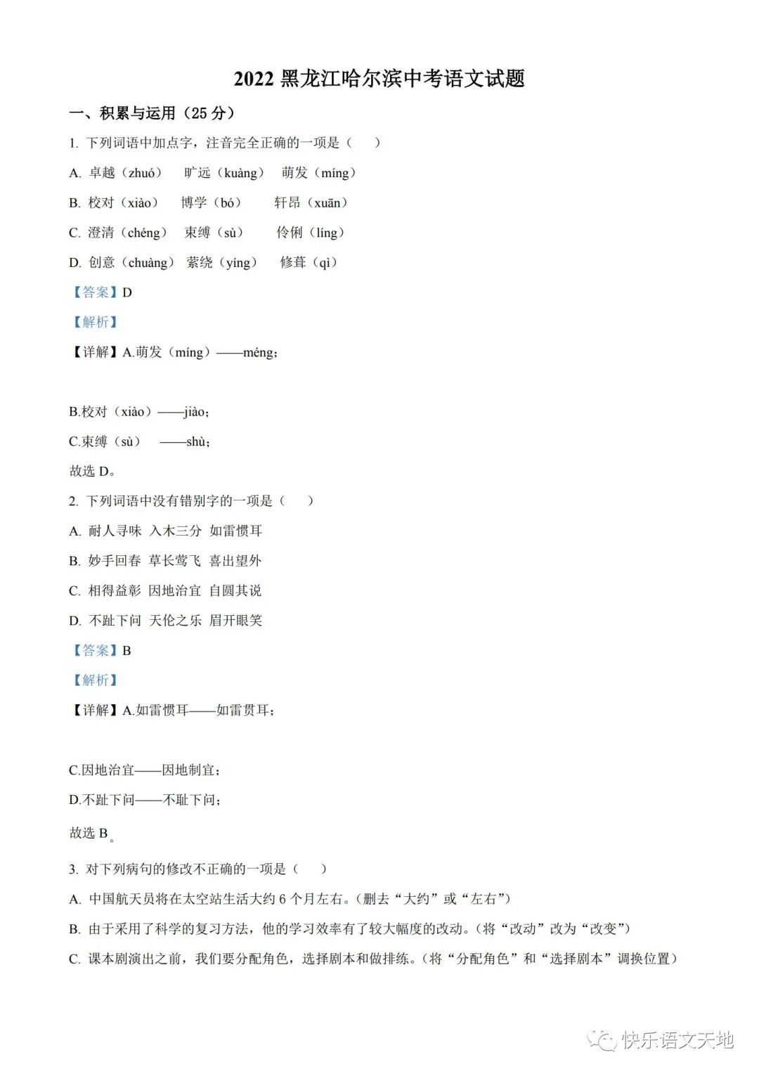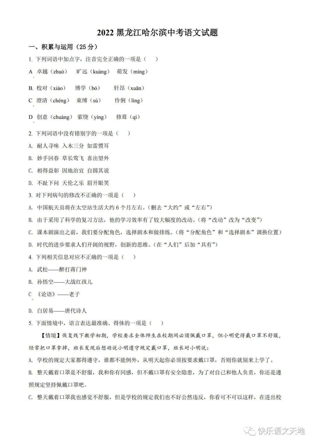 2022黑龙江哈尔滨中考语文试题一、积累与运用(25分)1.下列词语中加点字,注音完全正确的一项是()A卓越(zhuó)旷远(kuàng)萌发(míng)B.校对(xiào)博学(bó)轩昂(xuān)C澄清(chéng)束缚(sù)伶俐(líng)D创意(chuàng)萦绕(yíng)修葺(qì)2.下列词语中没有错别字的一项是()A.耐人寻味入木三分如雷惯耳B.妙手回春草长莺飞喜出望外C.相得益彰因地治宜自圆其说D.不趾下问天伦之乐眉开眼笑3.对下列病句的修改不正确的一项是()A.中国航天员将在太空站生活大约6个月左右。(删去“大约”或“左右”)B.由于采用了科学的复习方法,他的学习效率有了较大幅度的改动。(将“改动”改为“改变”)C.课本剧演出之前,我们要分配角色,选择剧本和做排练。(将“分配角色”和“选择剧本”调换位置)D.时代的进步要求人们开阔的视野,创新的思维。(在“人们”后加“具有”)4.下列相关信息对应不正确的一项是()A.武松——醉打蒋门神B.孙悟空——大战红孩儿C《论语》——老子D.白居易——唐代诗人5.下面情境中,语言表达最准确、得体的一项是()【情境】恢复线下教学初期,学校要求全体师生在校期间必须佩戴口罩,但小明觉得戴口罩不舒服,经常把口罩拿掉,班长发现后想劝说小明遵守规定戴口罩,班长对小明说:A.学校的规定大家都得遵守,谁都不能例外,从明天起你必须按要求戴口罩,否则你就别来上学了。B.整天戴着口罩是不舒服,我和你有同感,但不戴口罩有安全隐患,为了对自己和他人负责,你还是遵照规定坚持佩戴口罩吧。C.整天戴着口罩我也感觉不舒服,但是学校的规定我们也不好公然违反,你看可不可以这样,在进出校....