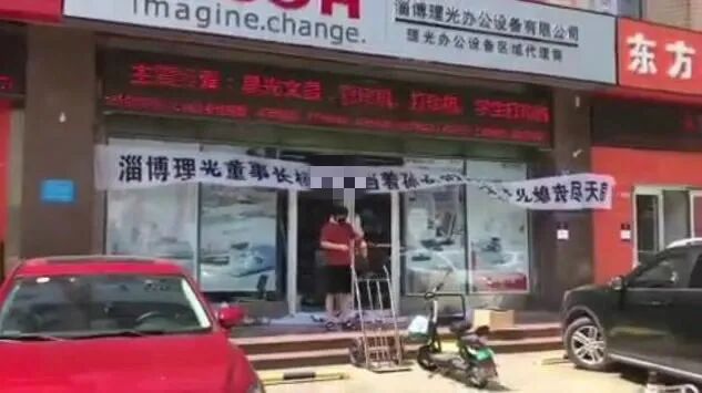 一男子在淄博理光办公设备有限公司门店敲锣称,自己的妻子在加拿大被父亲杨某当着孙女的面性侵。
