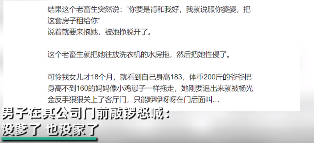 图源:腾讯新闻据男子陈述,疫情期间,他想方设法买了机票把自己的父母和妻女一起送到加拿大温哥华避难。结果在温哥华期间,自己的父亲想办法支开了自己的妈妈,然后在家里当着年仅18个月大女儿的面,性侵了自己的儿媳。事发后,男子在自己家公司门口拉横幅、敲锣痛斥自己父亲兽行的视频曝光在了网络上。