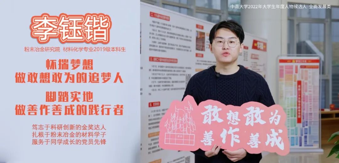 中国国际“互联网+”大赛国家级金奖;弥散铜合金两项国家发明专利;校、院学生会执行主席;党支部副书记……他是粉冶院2019级本科生,信仰坚定的中共党员、服务同学的学生干部、双创实践的粉冶菁英,都是他的名片。
