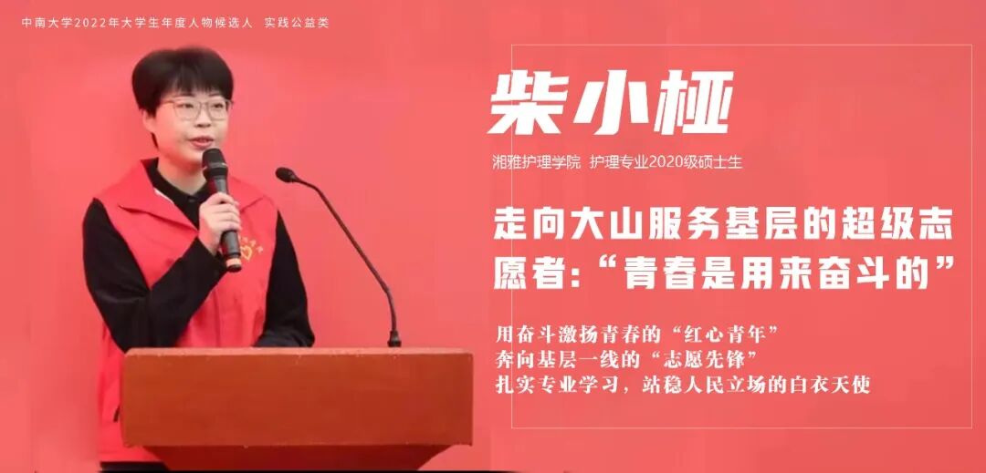 柴小桠本科时注册成为青年志愿者,加入学院青年志愿服务队,7年来个人志愿服务总时长达千余小时。作为护理专业学生,该生自本科入学以来就保持着刻苦学习的精神,专业扎实,技能过硬,毕业后保送至本校继续深造。尽管医学生学习任务繁重,该生始终对志愿服务工作抱有极大的热情,将专业知识同志愿服务工作相结合,学以致用,服务社会,以实际行动弘扬“奉献 友爱 互助 进步”的志愿者精神。