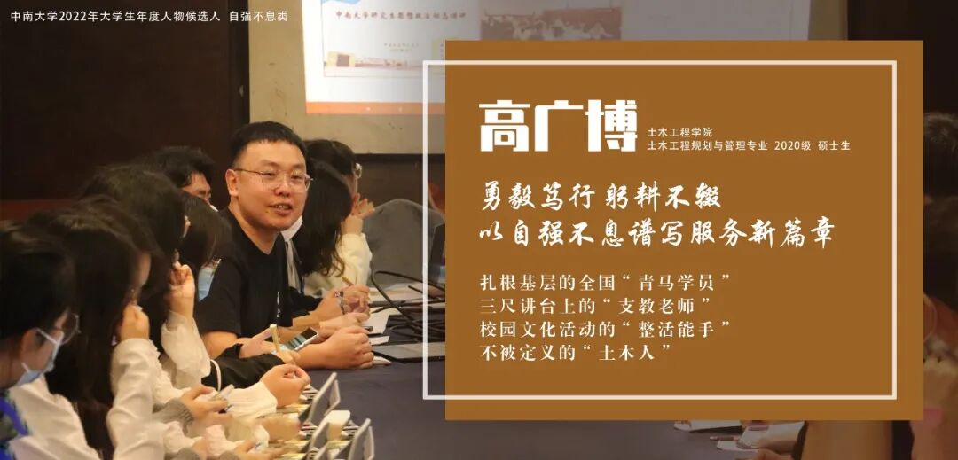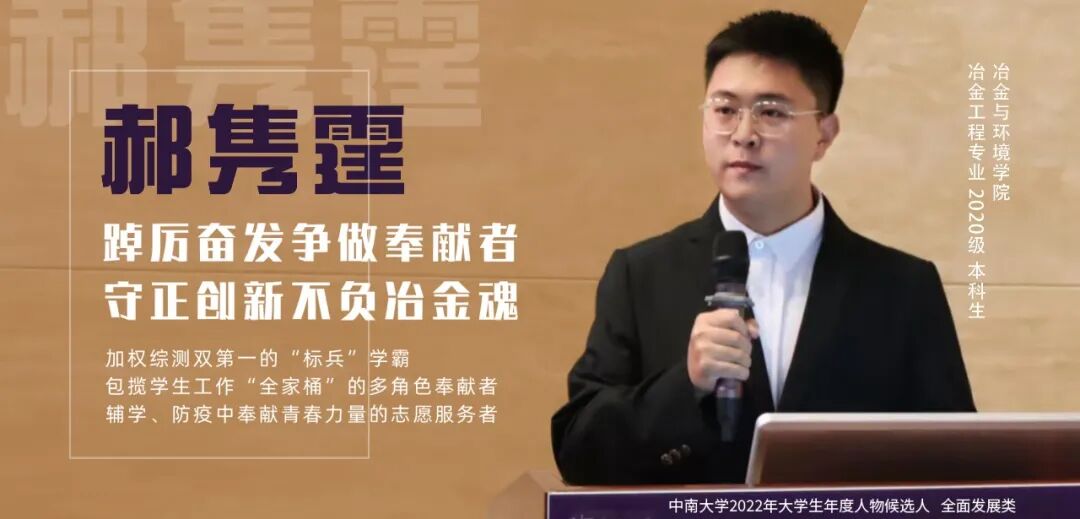 自强不息是他的代名词,他相信努力到一定程度幸运会不期而至,所以他一直在路上;他希望做一个现实的理想主义者,能用自己的正能量鼓舞更多人的成长。他连续三年为学院做经验分享,帮助学弟学妹成长;他为知新馆做新生引导课分享,照亮弟弟妹妹的大学之路;他受邀为“学冶为你”互助队做经验分享、他作为学院代表在二十大期间接受采访、他受邀在问渠长廊做榜样经验分享会,他始终踏实地弘扬道德风尚,不负中南好网民的称号,不忘自己的誓言。他的正能量鼓舞了许多学弟学妹,收到了数百位弟弟妹妹的反馈与感谢。