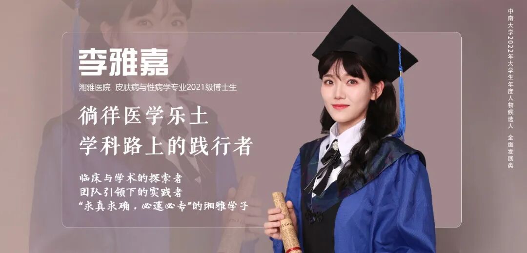 九年的湘雅时光,李雅嘉一直以高标准要求自我,品学兼优。在学术方面,她硕博期间的平均绩点均为3.80,专业资格考试均为优秀;硕士期间顺利开展并完成课题《红肉及加工肉摄入与成人特应性皮炎关联的四项横断面研究合并分析》,该课题有关核心成果曾获2019中华医学会第二十七次全国皮肤性病学术年会优秀壁报展示,以此课题为基础的硕士学位论文获得中南大学2022年优秀学位论文推荐,其衍生研究《膳食高盐通过影响肠道微生物而参与特应性皮炎发生发展的流行病学与机制研究》获2022年度中南大学研究生自由探索项目校级立项。同时在研究生期间她也进行了多项国家自然科学基金、省自然科学基金项目研究,她参与的由湘雅医院与湖南省人民医院合作项目获得2021年度“天地恒一”杯湖南省中医药科技二等奖(本人排名第二)。