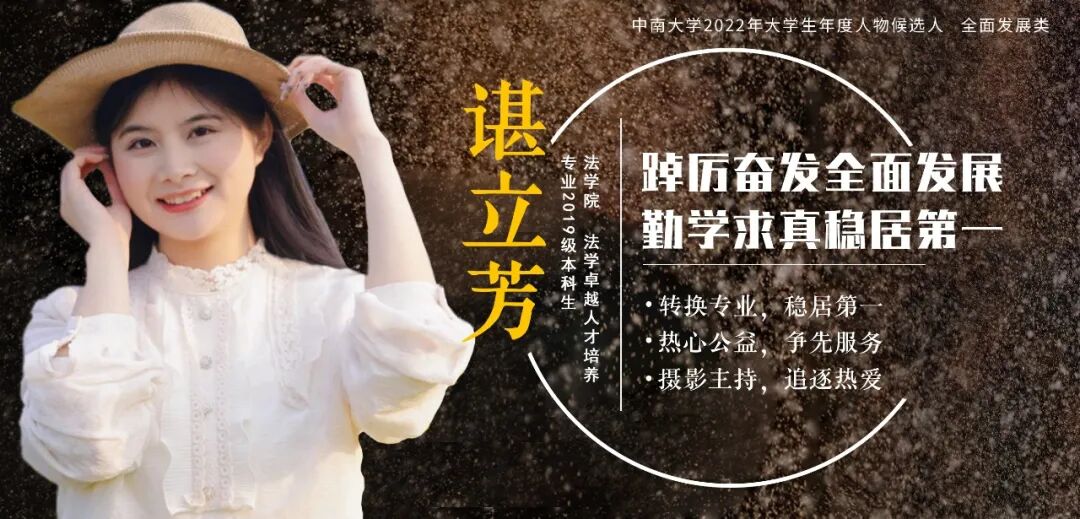 谌立芳曾说“大学生活千姿百态,我想有更多的色彩”。她曾担任法学T1901 班班长、中南大学法学院本科生第一党支部支委等多项职务,严谨高效地完成任务。谌立芳从求学之初就开始担任班长,至今已经15 年。担任法学 T1901 班长的两年里,她带领班级获得中南大学校级先进班集体标兵。班长一职带给谌立芳许多思考与成长,她也获得了同学老师的信任与支持。谌立芳担任法学院主持人队队长,在舞台上自信放光芒,她还曾获校级宪法演讲比赛一等奖、校级“宪法伴我行”微视频作品征集大赛二等奖。此外,谌立芳热爱摄影,常用相机记录美好的瞬间,目前是一名独立摄影师。