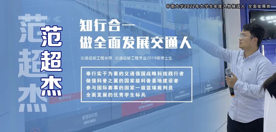 精勤钻研,他深耕轨道交通人因工程方向,十余篇科研论文与全国铁路青年科技创新奖第一完成人是他成果的体现;投身科普,他致力场馆建设与科普讲解,助推先进轨道交通科普基地晋升“国家级”;躬行实践,他被授予国家一级篮球裁判员,参与国际篮联男篮亚锦赛执裁工作;青春飞扬,他被湖南日报选为湖南大学生代表之一,在五四特别节目中展现中南学子风采。
