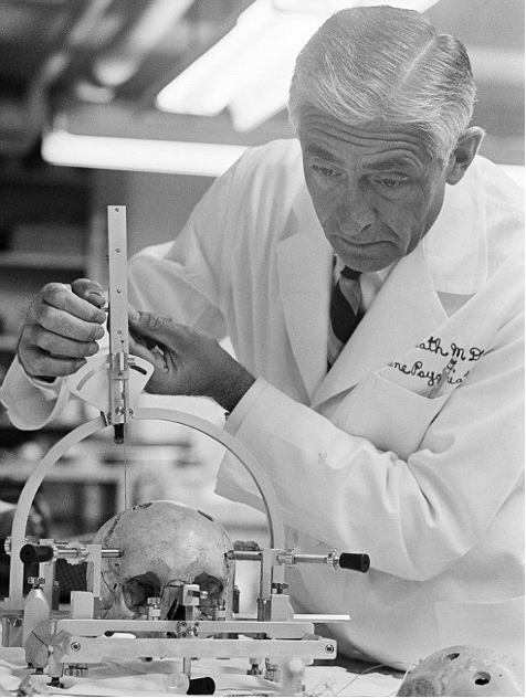 他们将他的颅骨后部上开了一个小洞,再把一个外型吓人的「立体定向头箍」安装在 B-19 的头上。