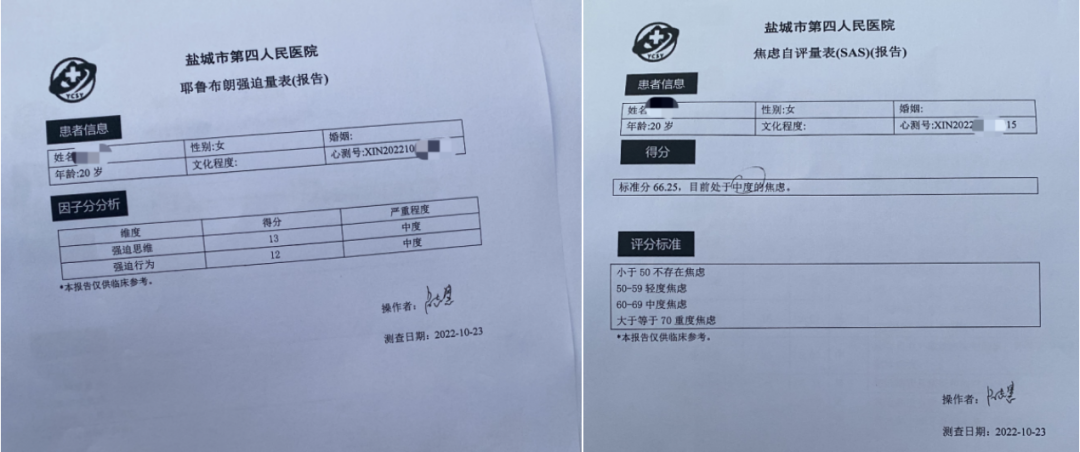 返回值班室后,姚某华发给受害人的微信聊天内容(图片由当事人提供)“我赶紧往另一个医生的值班室走。在走廊里,姚某华还用左手搂我的左肩,我就加快步伐往前走,经过姚某华的值班室时,他还拉我的衣服,试图将我拉进他的值班室,我告诉他走廊里有监控,他听到有监控就离开了。”当晚,护士施某把事情经过告诉另一位医生后便报了警。盐城市公安局亭湖分局当天出具的“行政处罚决定书”显示,姚某华以摸手、搂抱等方式猥亵女护士的行为“有本人陈述、证人证言、被侵害人陈述等证据证实”,根据《中华人民共和国治安管理处罚法》第四十四条之规定,对姚某华行政拘留七日。受害人中度焦虑,将向法院起诉猥亵事件发生后,护士施某前往盐城市第四人民医院就医。该院10月23日出具的报告显示,施某处于中度的焦虑状态,并有中度强迫思维和行为。
