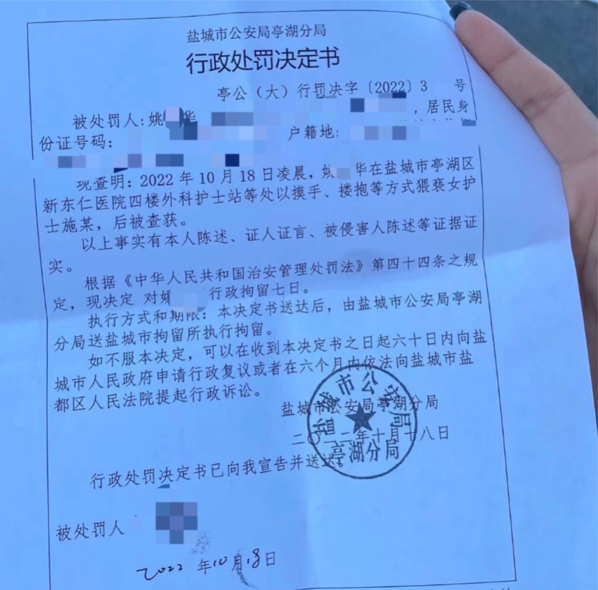 该护士向“医学界”提供的一份盖有“盐城市公安局亭湖分局”公章的“行政处罚决定书”显示:涉案医生姚某华被处以行政拘留7日。