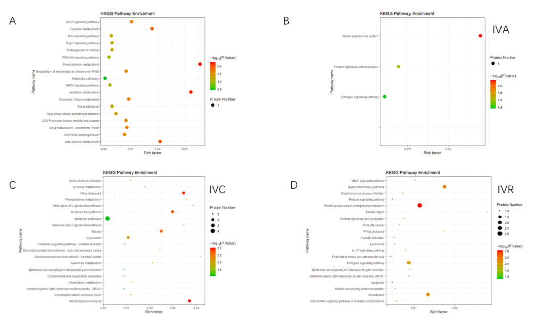 图2研究通过分析了不同抗VEGF药物治疗前后的房水,总共鉴定出874个蛋白质,其中定量蛋白为585个。IVA、IVC、IVR治疗前后分别发现17、43和34个差异蛋白(图2A-C)。其中,有7个蛋白在三组中均发生显著变化(图2D)。 2. 与抗VEGF治疗相关的功能分析研究首先对三组治疗中的共有差异蛋白进行GO和KEGG富集分析。研究发现无论是哪种治疗策略,VEGF信号通路和EGFR酪氨酸激酶抑制剂耐药通路都是被激活的(图4A)。在 GO-MF中发现VEGFR2与Hsp90蛋白结合相关(图3A),并且在GO-BP中发现其与细胞增殖相关,表明VEGFR2在抗VEGF治疗中会发生不同作用。