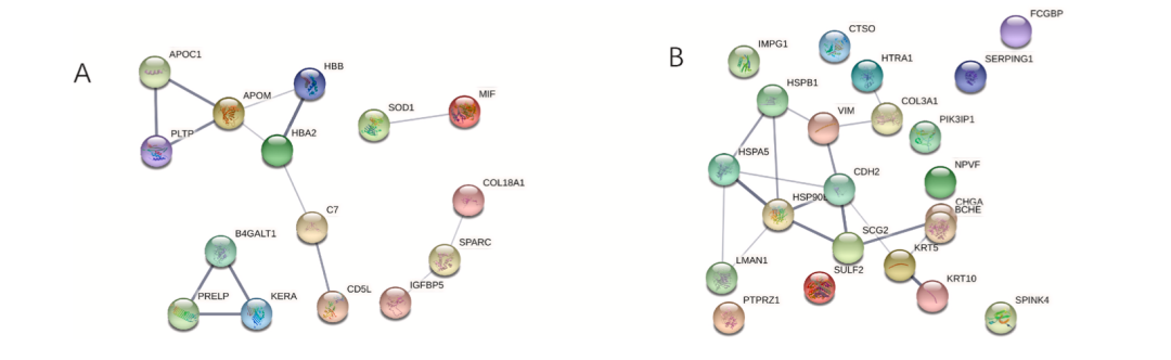 图3研究还发现RARRES1与细胞增殖有关,抗VEGF治疗后其下调表明其可能通过与VEGF相关的机制参与糖尿病性视网膜病变(DR)的病理生理学。ALDH3A1是早期DR与血管生成相关的候选基因,研究发现其在三组中均显著上调,并与细胞增殖有关,表明该蛋白可能在PDR背景下发挥保护作用。有趣的是,研究还发现hornerin、APOM和HSP90B是不同治疗组别中的特异性差异蛋白,它们与血管生成、脂蛋白代谢、炎症和氧化应激相关,所有这些都与PDR发病机制相关。
