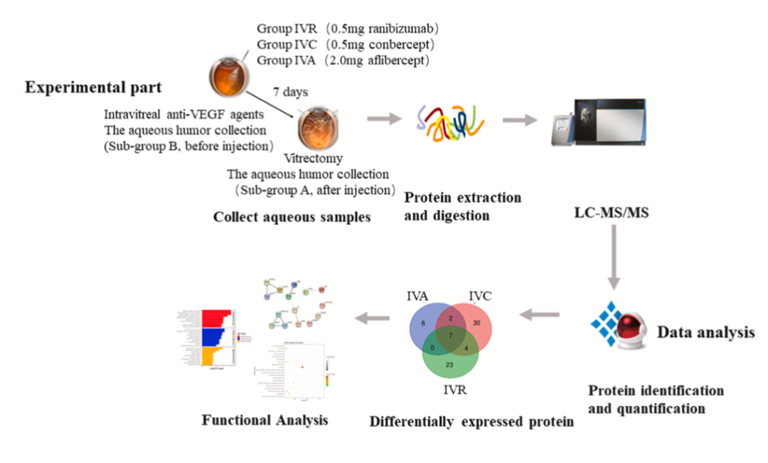 2022年2月,中国医学科学院北京协和医院眼科闵寒毅团队与中心实验室吴志宏团队合作,于Experimental Eye Research期刊上发表了题为“Proteomic changes of aqueous humor in proliferative diabetic retinopathy patients treated with different intravitreal anti-VEGF agents”的临床研究文章。该研究使用配对的治疗前和治疗后样本来比较三种抗VEGF药物(雷珠单抗、阿柏西普和康柏西普)对 PDR 患者的房水样本的蛋白质组影响,这些数据为 PDR 发病机制的研究提供了理论基础,并提出了抗 VEGF 治疗的潜在新靶点。近年来,抗VEGF治疗已广泛用于增殖性糖尿病视网膜病变(PDR)治疗。然而,其中一些患者对抗VEGF治疗反应不佳,VEGF不是影响PDR发病机制的唯一因素,并且不同的抗VEGF药物可能会对这些潜在的病理生理过程产生不同的影响,该研究使用三种抗VEGF药物(雷珠单抗(IVR)、阿柏西普(IVA)和康柏西普(IVC))进行治疗,并收集了患者治疗前后的房水样本进行了蛋白质组学研究,以评估和比较这些药物的影响。