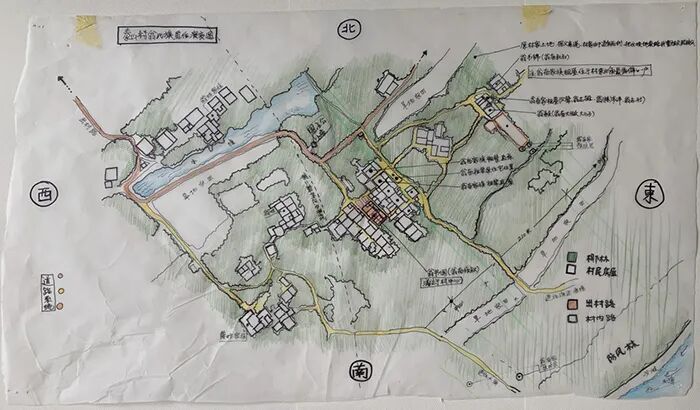 翁奋对家乡泰山村村落姓氏、家庭房屋、椰林坡地、农作田地、水塘、翁家祖坟、道路与海洋地理关系与村庄分布和风水关系进行研究分析所绘制的平面图。