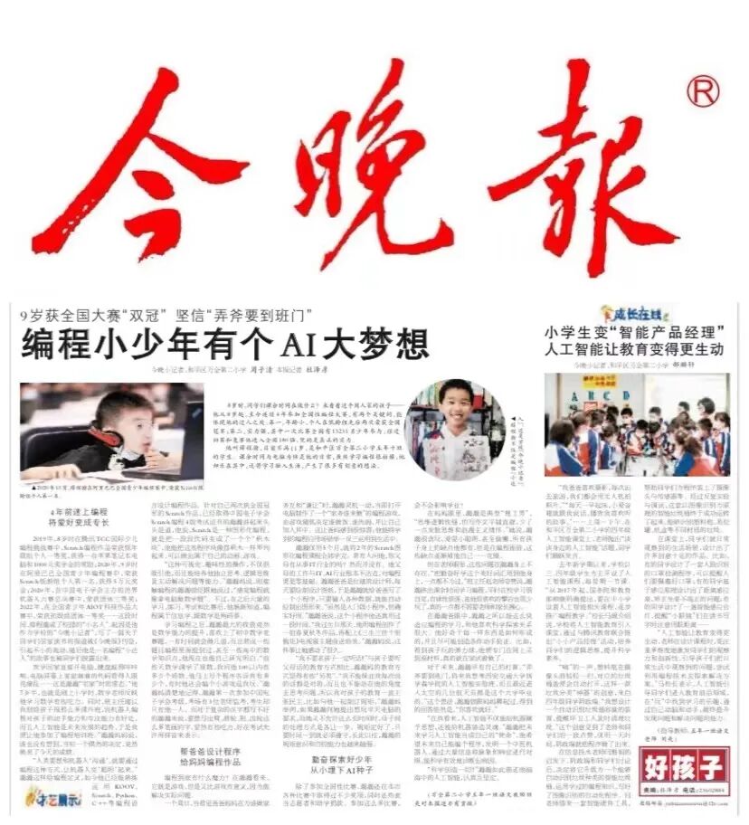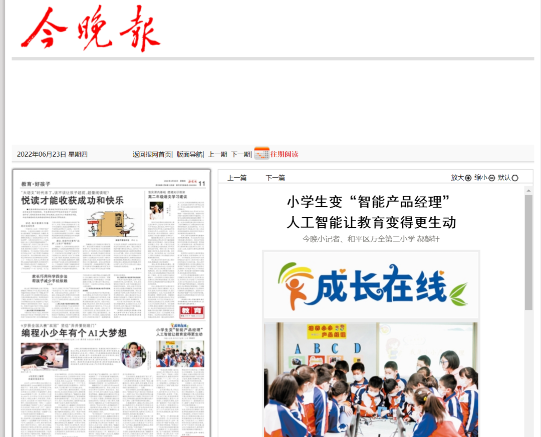 近年来,AI发展越来越快,深刻影响着人们的生活、工作和学习。万全第二小学紧跟时代步伐,在追求高质量教育发展的前提下,更加关注学生发展需求的过程和充分发挥个性潜能的结果。为探寻“双减”时代课后服务工作的更多可能性,学校推出了AI活动课程,受到了同学们的热烈欢迎,同时涌现出许多在人工智能方面有特长的“编程少年”。 6月23日,《今晚报》用半个版面的篇幅,介绍学校活动和学生风采。在《今晚报》杜泽彦记者的帮助下,五年一班郝麟轩同学的报道《课堂变身“小小产品经理” 人工智能让教育变得更生动》荣登在《今晚报》“好孩子”专刊中。今天,就让我们把目光聚焦在万全第二小学人工智能课程的课堂主阵地。