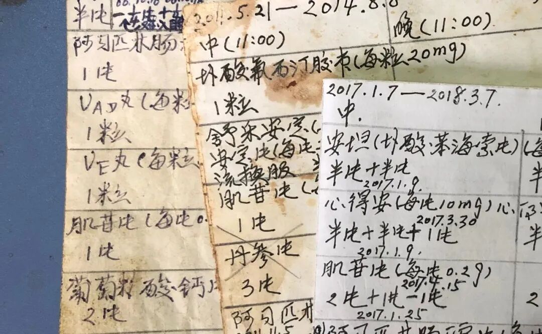 晚上7点,这是宋明丽的吃药时间。每天早上,宋明丽要按照自己写好的药单分药,为了避免弄错,三张单子的右上角分别写着小字“儿”、“宋”、“王”。老式双开门的黄色药柜比宋明丽还高,从地面起一共6层,都是满的。儿子即便做了脑部手术,也一定不能停药,情况不对了,还要随时调药。