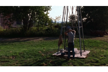 弗朗西丝卡,会隔着桥的缝隙,偷看罗伯特,罗伯特突然喊她,她才回过神,罗伯特洗澡的时候,她会在窗户的缝隙里,偷看罗伯特,当她意识到自己的奇怪行为后,走开,又忍不住去看他。