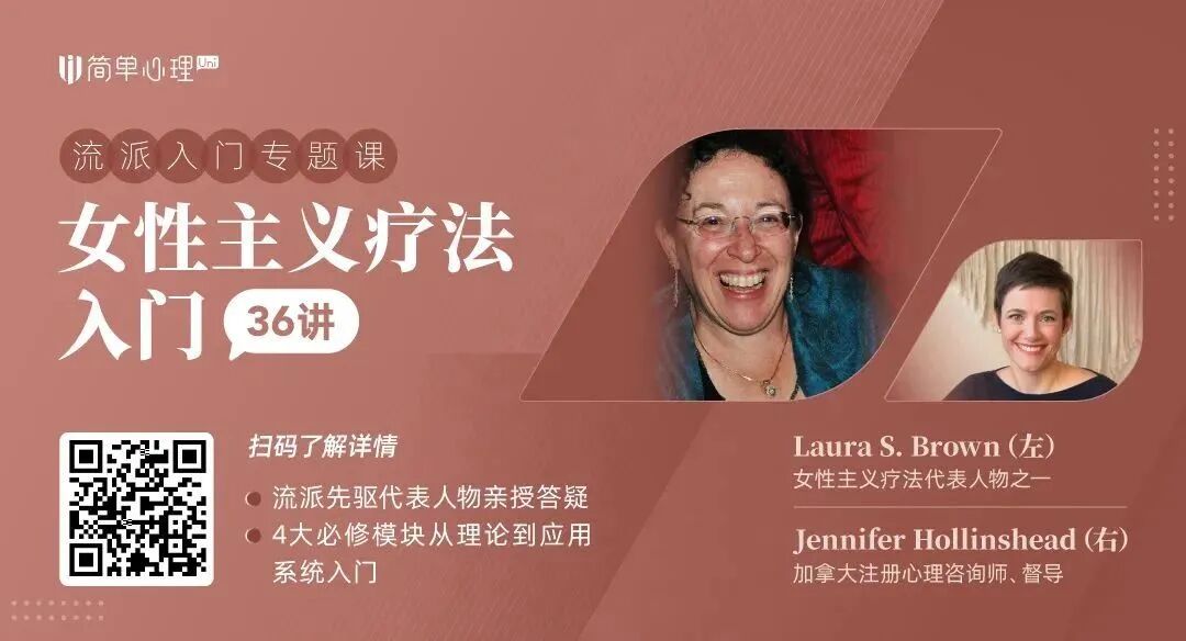 03我们的来访者能走多远,取决于我们自己能走多远布朗将女权主义心理学描述为对“性别和权力如何受到每个人交叉身份的影响”的研究。她因其在多元文化能力、创伤、女权主义治疗理论和LGBT问题方面的工作而获得无数专业组织的极大荣誉。但布朗认为她在2004年被授予SPW的卡罗琳·伍德·谢里夫奖是她职业生涯的巅峰。她将这一荣誉描述为“女性主义心理学家职业生涯的顶点”,而她也是第一个获得这一荣誉的非学术临床实践者。布朗表述表示很早就明白一句行业里的老话:我们的来访者能走多远,取决于我们自己能走多远。所以出于对来访者福祉的责任感,她不断鞭策自己去疗伤,因为她觉得那样做才是正确的。 至于到底为什么要成为心理治疗师?布朗博士是这样说的:“这个问题的答案既是前面说的所有理由,也不是前面说的任何一个理由。心理治疗师是一个特别奇怪的职业:要和痛苦中的人们谈上一个又一个小时,和无法用语言表达的东西打交道,还要让倾听成为我们的本职工作——所有这些都显得和21世纪的文化社会格格不入。而我成为一个心理治疗师的真正原因,是我发现只有在和来访者的这些关系中,我才真正开始了解自己,了解对我来说最重要的一些东西。是这个职业要求我不断地成长,去思考生命存在的奥义,去寻找在绝望中重拾快乐的能力。是从事心理治疗让我找到了完整的自我,并让我能够在生命中的每一天里,不断追寻犹太教义中‘治愈世界’的意义。”好课推荐简单心理新推出《女性主义疗法入门》课程由女性主义疗法代表人物劳拉·S·布朗博士亲授。理论+实操+伦理+案例,入门必学??新课首发,长按识别下方二维码查看课程??