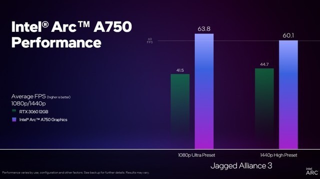 此外,英特尔指出,在《铁血联盟3》游戏中,英特尔锐炫A750图形显卡的性能优于带有12GB显存的GeForce RTX 3060显卡,玩家可以稳定地在1080p和1440p分辨率下获得60fps以上的画面帧率。
