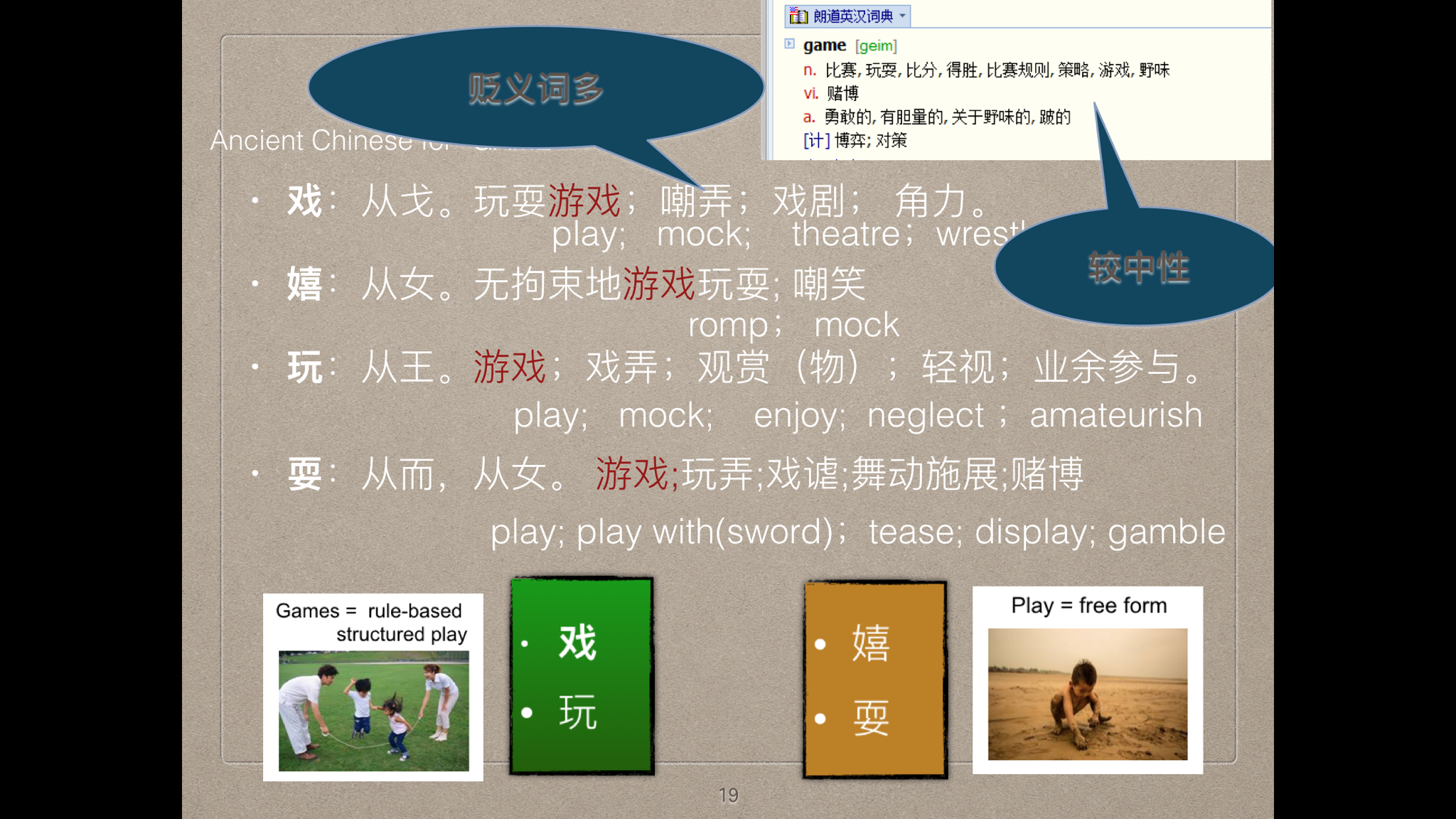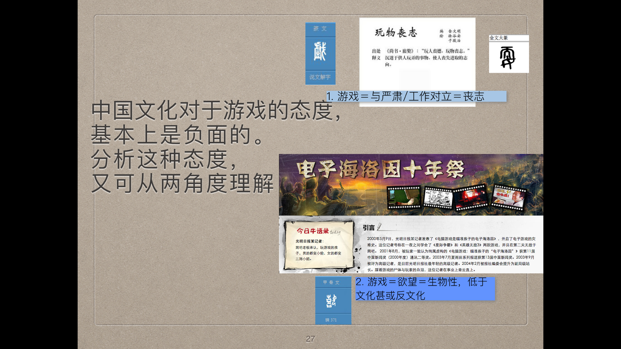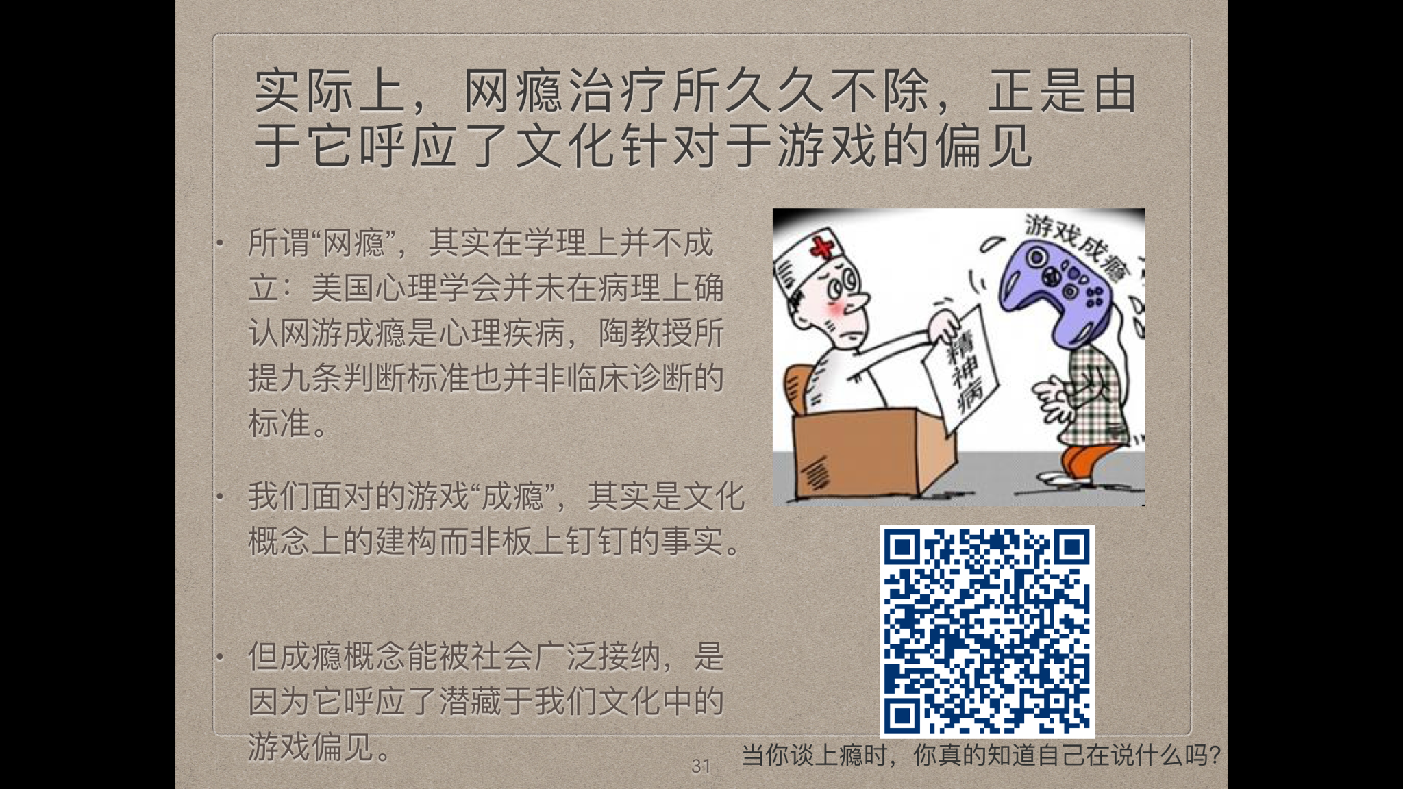 3.家长和社会这么轻易就信了这些其实并不懂游戏,可能只懂上瘾的砖家,是因为他们的说法迎合了我们文化对游戏长久以来的偏见。我曾考证过在中文里表达游戏的几个字的字形与字义,亦从二十五史及中华语料库中检索“游戏”常用的场景,最后得到的结论是儒家文化,特别是宋明以后的儒家文化长期贬低游戏,视其为不务正业之途,只有昏君佞臣及动物才游戏。而因为这游戏者的群体几乎是生物的,是低于文化的,游戏就被当成一种欲望的媒介,成瘾的文化链条因而建立。但这是偏见,早就被驳倒啦,其实我们讲这个也讲了好多年了,只是可惜影响力比较小,大多数人还不知道而已。希望这次科普能稍微改善一下这种状况,也请关心网瘾的大家帮忙多传播。