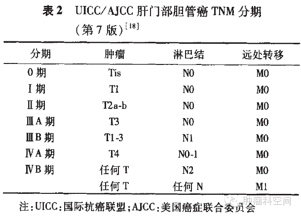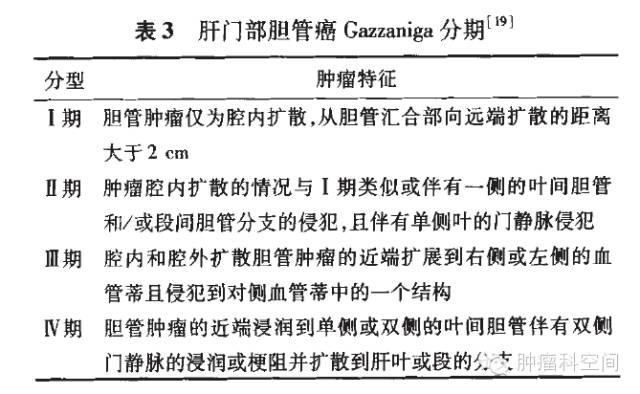 (1)肿瘤分期(T分期)基于肿瘤数目、血管侵犯、及肿瘤肝外直接侵犯等三个主要因素进行分期。·TX原发肿瘤无法评估。·TD无原发肿瘤证据。·Tis原位癌。·T1肿瘤生长局限于胆管壁内,侵及管壁肌层及纤维组织层。·T2a肿瘤生长超出胆管壁侵及周围脂肪组织。·T2b肿瘤侵及邻近肝实质·rr3肿瘤侵犯单侧门静脉或肝动脉分支·T4肿瘤侵犯门静脉主干或双侧门静脉分支;或侵犯肝固有动脉;或侵犯双侧二级胆管分支;或侵犯单侧二级胆管分支及对侧门静脉或肝动脉分支。(2)淋巴分期(N分期)基于存在或无区域淋巴结转移。区域淋巴结包括:位于肝门、沿胆囊管、沿胆总管、沿门静脉和肝动脉的淋巴结。·NX,区域淋巴结无法评估。·N0,区域淋巴结转移阴性。·N1,区域淋巴结转移阳性(胆囊管、胆总管、肝动脉和门静脉旁淋巴结)。·N2,腹主动脉旁、下腔静脉旁、肠系膜上动脉旁,和/或腹腔动脉淋巴结转移。(3)远隔转移(M分期)·M0,无远隔器官转移。·M1,存在其它器官转移。(4)结合T、N和M分期,HCC TNM分期(第7版,I类推荐)3.根据肿瘤侵犯胆管和血管情况的分期(1)Gazzaniga分期(II B类推荐):增加了血管受侵犯的程度来评价肿瘤侵犯的程度,但肿瘤在胆管内扩散的评估方式具有局限性,使其在临床实践中的应用价值有限。见表3。