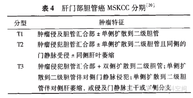 (2)MSKCC分期(II A类推荐):根据Bismuth—Corlette分型评价胆道受肿瘤浸润程度,增加了对血管的侵犯和肝萎缩的评价,但分期中纳入肝萎缩的评判因素定义不清、且不完全符合临床实际情况,临床应用的实用性受限。见表4。