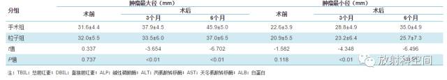 患者术后3、6个月肿瘤体积较术前增大(表1)。术前肿瘤最大径、最小径,与术后3个月相比t值分别为1.183、1.813,差异均无统计学意义(P均>0.05);与术后6个月相比t值分别为3.763、3.484,差异均有统计学意义(P均<0.05)。