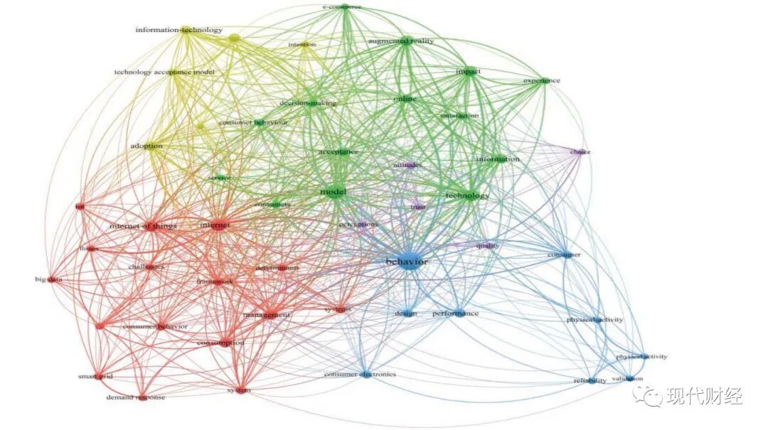 从图2 的节点颜色分类看,蓝色与消费者行为以及可靠性和有效性等各类万物互联产品或服务的特性相关,红色与互联网、物联网、大数据等有关,绿色与技术、模型、AR 等相关,紫色与消费者感知、消费者态度、消费者信任、消费者选择相关,黄色与消费者采用、技术接受模型等相关。