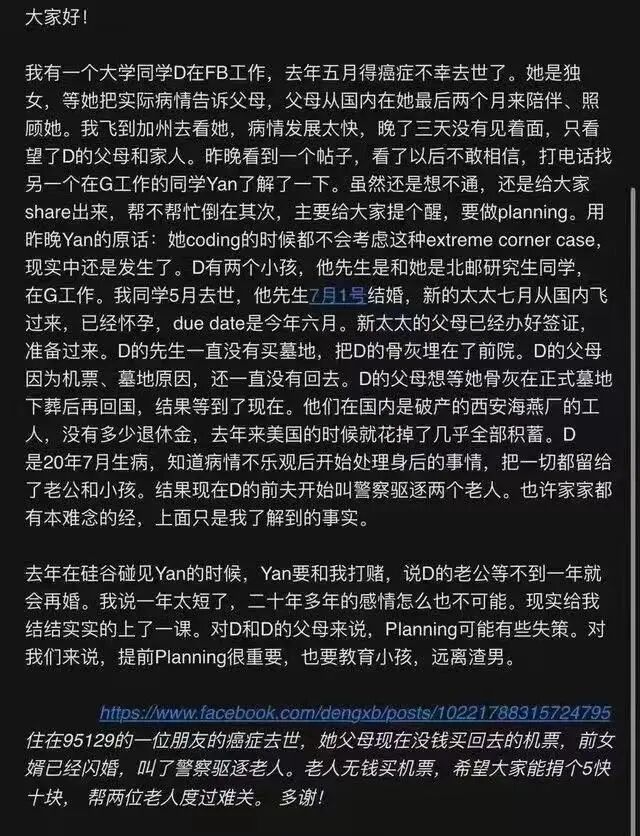 写信人是前脸书程序员,北邮计算机系硕士校友,已故邓女士的朋友,在网上为邓女士的父母众筹从美国回中国的机票钱。