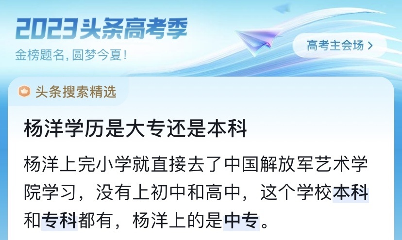 小编在看到这一消息的时候,也上网核实了一下杨洋的学历,其中杨洋就读的中国解放军艺术学院是有本科专业和专科专业的,杨洋上的是中专。