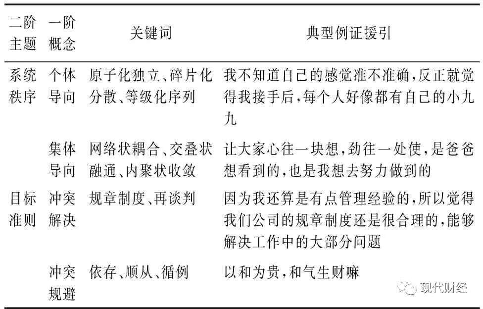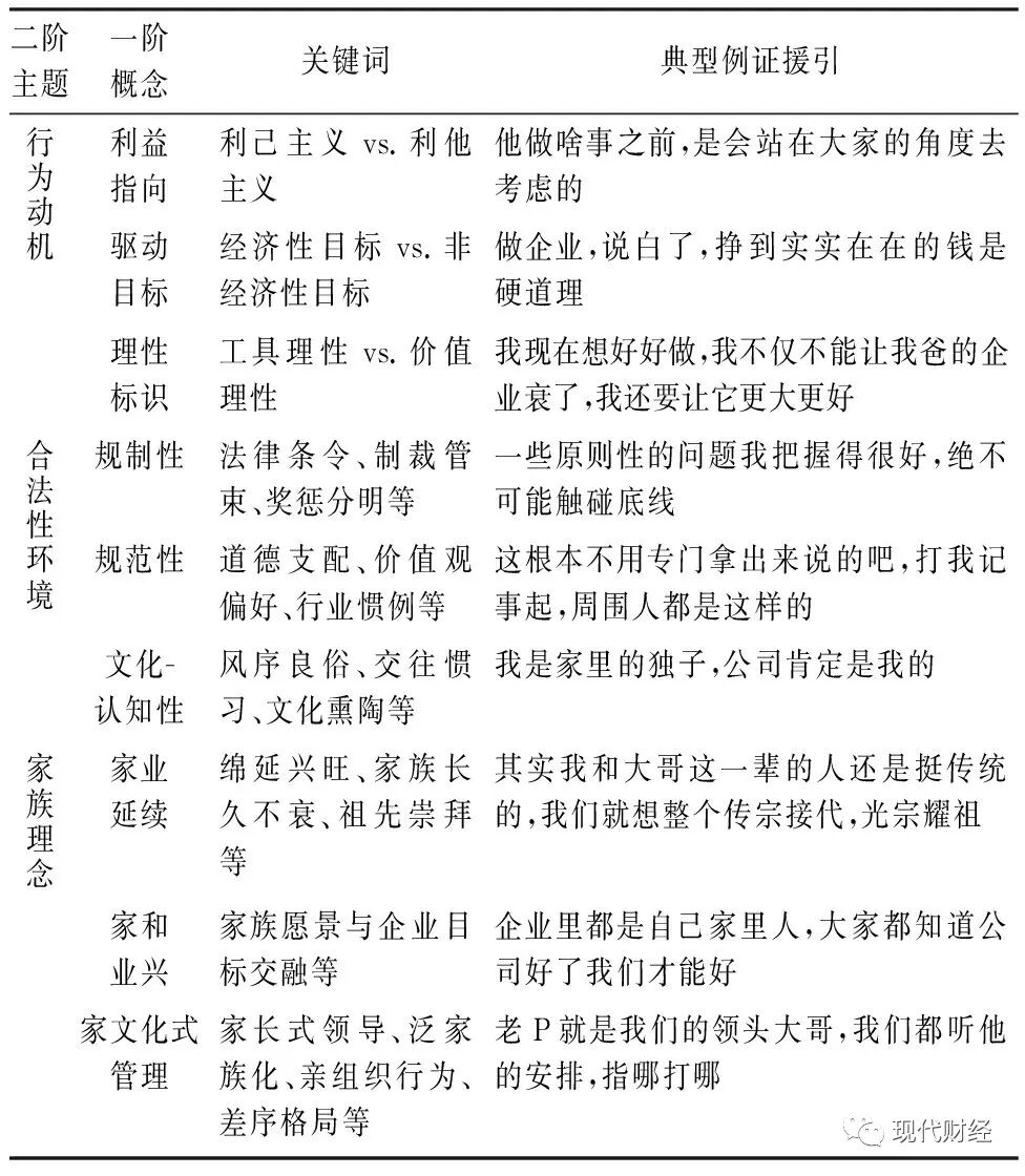 (2)权威机制 包含法理的牵制,但家族企业的权威机制更多地由传统惯习中的角色地位与日常交往中的人格魅力构成。这也对韦伯[26]提出的权威理论做出了些许回应。在访谈过程中,TB公司的很多人提及小H总时,不约而同地运用“豁达、有胆识、有担当”等形容词加以描述,这些在职权之外的性格评价折射出了作为治理者的人格魅力。研究团队通过观察还发现,家族企业较高程度的“家本位”运作特征,本质上是一种延续的习惯与情感联结,保障了传统型权威的生成渠道。此外,在与非家族企业的对比中,非人格化的理性界限不甚清晰,但是权力距离与秩序等级仍然存在。