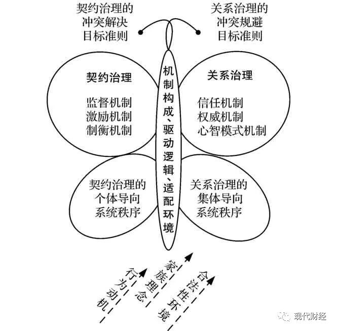 首先,治理模式跨代变迁前后两种治理模式的机制“是什么”?学界将以正式化章程作为治理手段的方式称为契约治理[6];反之,将强调通过协调人际关系去维护组织系统稳定的治理模式界定为关系治理[7]。纵览现有文献后发现,学者们在关于两种治理体系功能与效用等方面的差异性研究已较为深入,倾向于从属性特征、作用价值等方面进行拓展,但是对二者机制要素的对照探讨还不够完整。