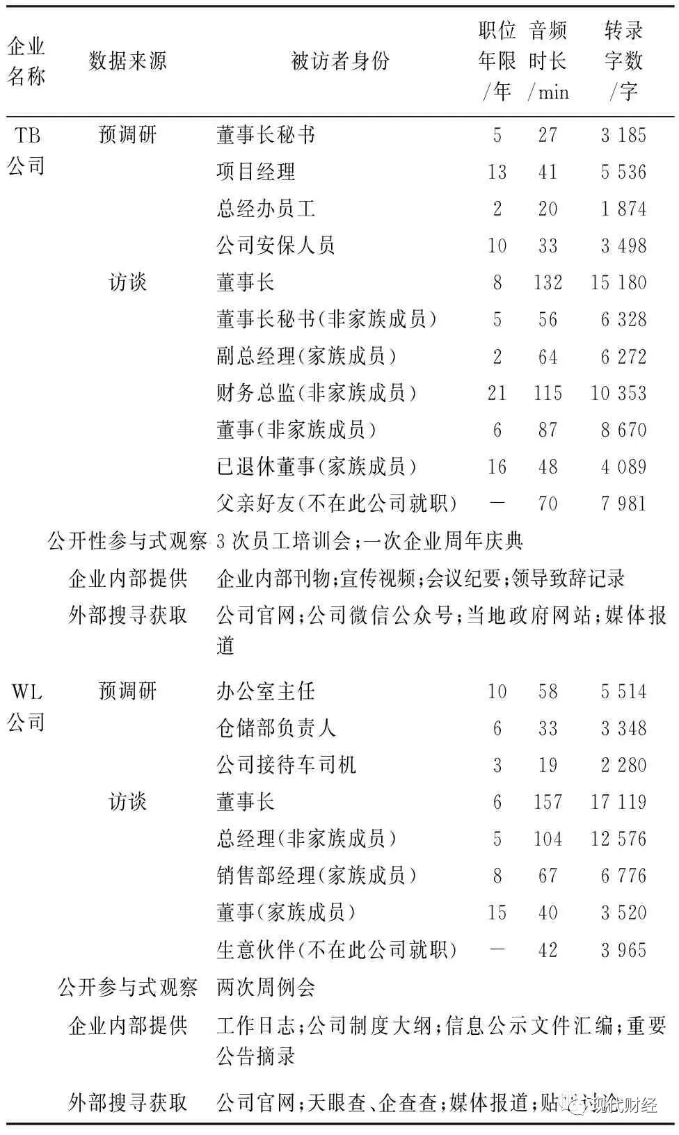 研究团队对数十家已完成代际传承的家族企业做了预调研,借助理论抽样方法,最终选取TB与WL两家具有案例标本价值的企业进行更为细致的探究。选定企业统合以下五大原则:①鲜明性。父辈意外辞世与子代无计划性继任导致企业组织内部的矛盾迸发,为考察治理模式跨代变迁提供了典型的学理探究情境。②受控性。两个案例企业域属徽州地区,寓公司经营于徽文化熏陶与徽商精神浸润之中,父辈治理特征高度相似。此外,父辈意外离世均构成两家企业演化轴线上的重要时间节点。两家企业内外部治理环境高度相似,极大地降低了无关因素的干扰,内部效度得以提升。③差异性。TB公司与WL公司的子代在传承后第二阶段呈现出了截然不同的治理变迁路径,其方式、过程及结果的差异提供了比对框架,在剖析理论意涵的同时保证了外部效度。④适配性。本研究为探寻家族企业治理模式的跨代变迁过程,考察两家案例企业代际传承后阶段性周期的治理策略,这为达成研究目标提供了现实理据。⑤数据可获得性。本研究团队与案例企业保持长期往来,关系融洽。公司董事长和部分高管团队成员同意参与多轮互动访谈,为更直观了解公司治理实践过程提供了丰富素材。此外,两家公司的官网建设成熟、宣传资料充裕、工商大数据信息详实,助推此案例研究的分析效力与构念效度。