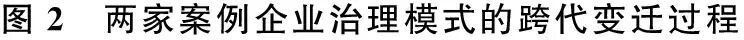两家案例样本企业均成立于20世纪90年代,创业董事长的意外离世导致子代无计划性继任。研究团队在对两家公司治理模式的变迁过程进行探究时发现,两家案例企业的子代董事长在继任初期,均无法继续沿用父辈的关系治理模式,故侧重于采取一系列契约保障措施迅速构建秩序。而在后期发展阶段,两家公司却呈现出了不一样的治理特征。一家公司的子代董事长很快建立起以他为中心的关系网络,逐渐转向关系治理为主的治理风格;另一家公司的子代董事长则不断强化着契约治理。两家案例企业治理模式的跨代变迁过程见图2。为全面探寻家族企业治理中的这两种模式,应首先明确契约治理和关系治理“是什么”。
