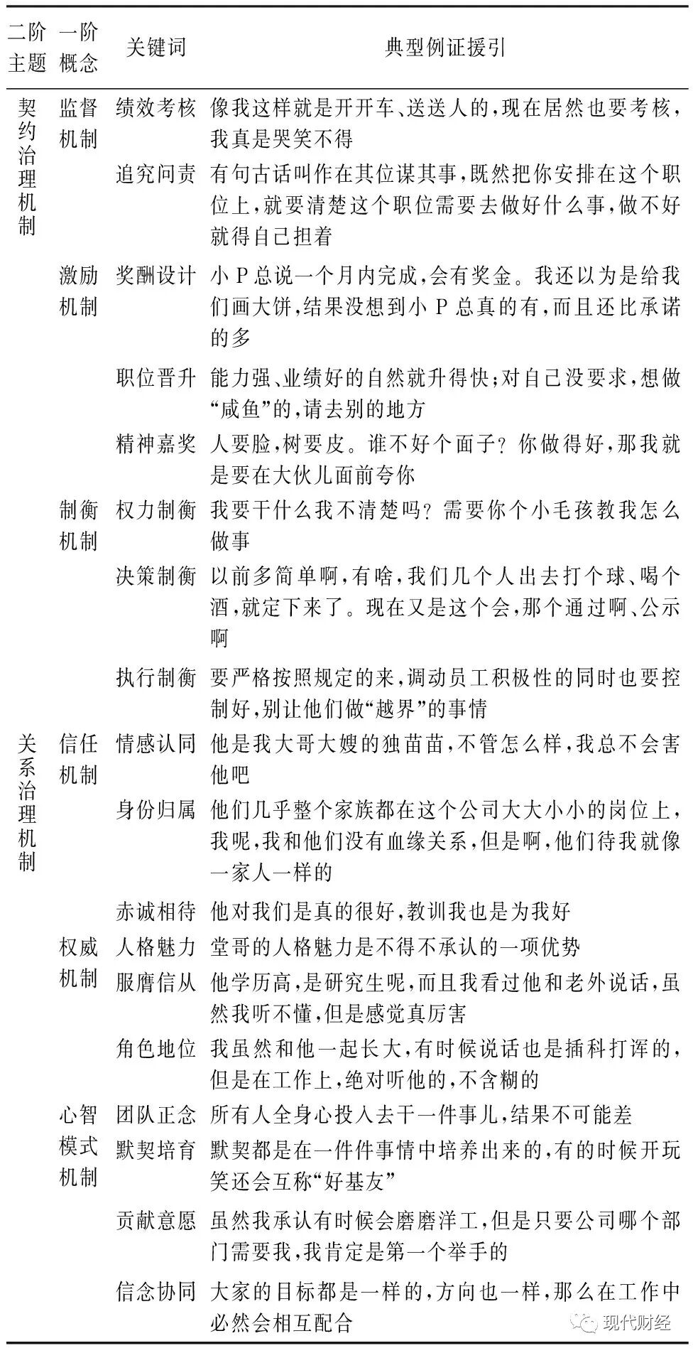 前文立足于企业契约理论与案例素材,结合现有研究,提炼出契约治理的三大核心机制。毫无疑问,契约治理与关系治理均是治理主体为完成治理任务的一种手段,其最终目的相同。故而,以相对完备的契约治理机制研究作为参照体系,有助于厘清关系治理的机制构成。接下来,将案例资料与社会嵌入理论框架中的关系要素相结合,细化考察关系治理中的“信任、权威、心智模式”三大机制。